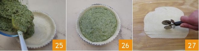 Vierte el pesto preparado previamente dentro del molde 25 y nivélalo ligeramente 26. Retoma el exceso de masa y extiéndelo nuevamente, siempre obteniendo un grosor de aproximadamente 1 cm, y corta rombos 27.