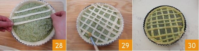 Coloca los rombos por encima de la mezcla 28 y úntalos con el huevo previamente batido 29. Hornea en el horno estático a 170° durante 50 minutos (si utilizas el horno con ventilador, hornea a 150° durante unos 40 min). Saca del horno 30 y deja que la tarta con pesto mixto y panceta se enfríe un poco antes de servirla.