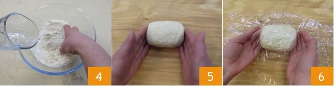 En este punto, coloca la mezcla obtenida en un bol y añadiendo poco a poco el agua fría amasa todo rápidamente 4, luego pásalo a una superficie de trabajo y continúa amasando hasta obtener una masa firme y bastante elástica 5. Una vez lista, envuelve tu masa quebrada en film transparente 6 y déjala reposar en el frigorífico durante al menos 40 minutos.
