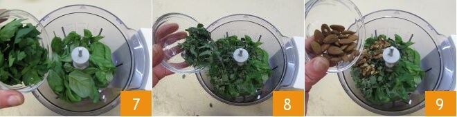 Mientras tanto, comienza a preparar el pesto para tu relleno. Coloca en un procesador de alimentos la albahaca, el perejil 7, la mejorana 8, las nueces y las almendras 9.