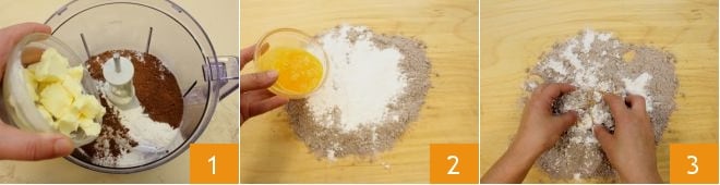 En un procesador coloca la harina tamizada, el cacao y finalmente la mantequilla fría cortada en cubos 1. Mezcla todo hasta obtener una mezcla arenosa y harinosa. Transfiérela a una superficie de trabajo dándole la clásica forma de fuente, luego añade el azúcar glas y las yemas batidas 2. Procede amasándola enérgicamente con las manos 3.