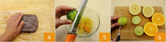 Ralla la piel de la naranja, el limón y las limas 5, luego córtalos por la mitad 6.