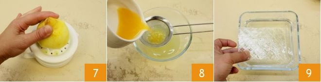 Exprime todos los cítricos 7 y a este punto filtra la mezcla de jugos con un colador 8. Resérvalo y continúa con la cocción de la crema. Pon la gelatina en remojo en un poco de agua fría para que se ablande 9.