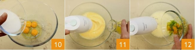 En un bol grande coloca las yemas, los huevos enteros y el azúcar 10 y con la ayuda de unas varillas eléctricas monta hasta obtener una mezcla clara y espumosa. En este momento añade en hilo los jugos de los cítricos 11 y sus cáscaras ralladas 12, continuando a montar para amalgamar bien los ingredientes.