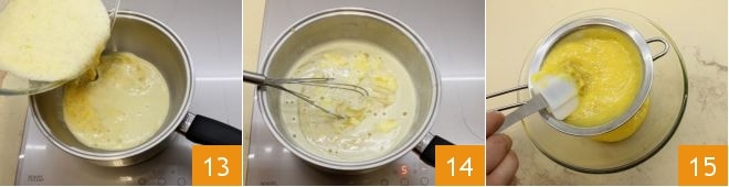Ahora transfiere todo a un cazo para cocinar la crema al baño maría 13: si no tienes el utensilio adecuado, coloca en una olla llena con pocos dedos de agua el bol con la mezcla, de manera que el fondo no toque el agua. Cocina a fuego lento durante 2-3 minutos mezclando con unas varillas, luego añade la mantequilla en trozos 14 y cocina durante otros 10 minutos hasta obtener una crema espesa que debes filtrar con un colador, ayudándote con una espátula 15.