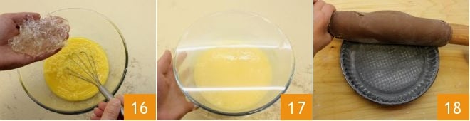 Escurre la gelatina y escúrrela bien, luego añádela a la crema y disuélvela mezclando con cuidado y durante largo tiempo 16. Si es necesario, fíltrela nuevamente. Cubre la crema con film transparente 17 y déjala enfriar en el frigorífico durante al menos 1 hora. Mientras tanto, cocina la base de la tarta: coloca el bloque de masa quebrada sobre una superficie ligeramente enharinada y extiéndela con el rodillo a un grosor muy fino, de unos 5 mm, luego envuélvela alrededor del rodillo enharinado y colócala en un molde de 24 cm previamente engrasado y enharinado 18.