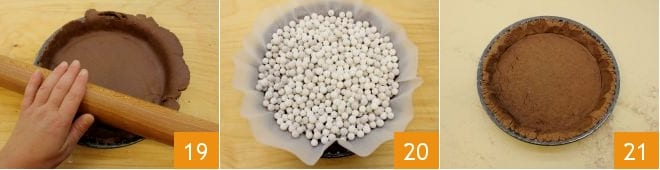 Con la ayuda del rodillo elimina de los bordes el exceso de masa 19, luego forra la base con papel de horno y pon encima las esferas de horno adecuadas (si no las tienes, puedes usar legumbres secas) 20. Hornea en horno estático precalentado a 170° durante 40 minutos (si es con ventilación, a 150° durante 20 minutos) y, una vez cocida, deja enfriar la tarta en el molde 21.