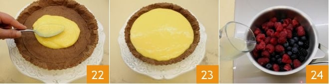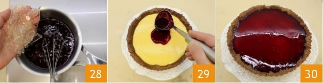 Transfiere la salsa a un cazo y añade la gelatina retirada del agua y bien escurrida, luego disuélvela a fuego lento, mezclando la mezcla durante 5 minutos 28. Apaga el fuego y retira del frigorífico la tarta rellena. Vierte el coulis caliente sobre la superficie, ayudándote con un cucharón 29 y dosificándola de manera que no se desborde de la tarta 30. Coloca el dulce en el frigorífico durante al menos otras 2 horas.