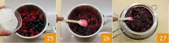 Añade el azúcar glas 25, mezcla hasta que todo esté bien amalgamado, luego deja cocinar un minuto más a fuego bajo 26. Filtra con un colador la mezcla obtenida para eliminar posibles semillas: presiona bien los frutos con el dorso de una cuchara y recoge la salsa dentro de un cuenco 27.