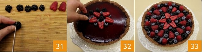 Transcurrido el tiempo necesario, puedes terminar con la decoración: corta los frutos del bosque 31 y colócalos a tu gusto sobre la tarta 32.