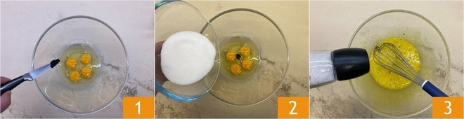 Para preparar la tarta de coco y chocolate, lo primero que debéis hacer es verter los huevos en un bol. Añadid las semillas extraídas de la vaina de vainilla y el azúcar 2. Batid a mano con unas varillas y añadid una pizca de sal 3. No es necesario obtener una mezcla montada, basta con que sea espumosa.