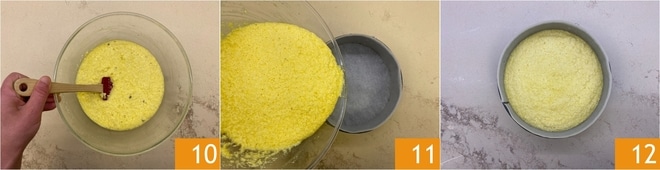 Una vez mezclado todo 10, dejadlo reposar durante 20 minutos en el bol, a temperatura ambiente. De esta manera, el coco se hidratará, obteniendo después una tarta más esponjosa. Pasados los 20 minutos, verted la mezcla en un molde desmontable de 24 cm, forrado con papel de horno 1112.