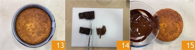 Hornead en horno estático precalentado a 170° durante 50 minutos. Pasado el tiempo de cocción, haced la prueba del palillo y sacad del horno vuestra tarta 13. Dejadla enfriar completamente y transferidla a una rejilla. Picad finamente el chocolate negro 14 y derretidlo al baño maría. Vertedlo sobre la tarta fría 15.