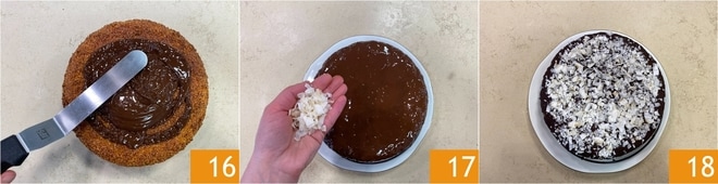 Niveladlo con una espátula 16, dejándolo caer también por los bordes. Decorad con las escamas de coco y guardad en el frigorífico para que se endurezca 17. Una vez que el chocolate se haya solidificado, podréis servir vuestra tarta 18.