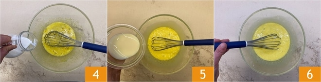 Añadid la nata 4 y la leche condensada 5. Mezclad todo siempre con las varillas a mano 6.
