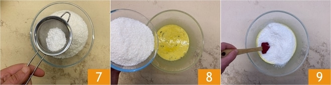 Tamizad la levadura en polvo directamente en el bol del coco rallado 7. Mezclad los polvos y vertedlos en la mezcla 8, mezclando con una espátula 9.