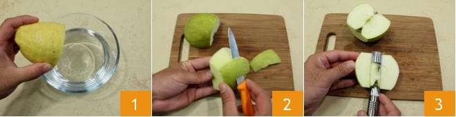 Para preparar la tarta de manzana y zanahoria, comienza preparando el agua acidulada que servirá para evitar que las manzanas se oscurezcan una vez cortadas: exprime el jugo de 1 limón 1, cuélalo, y viértelo en dos boles con agua fría. Lava las manzanas verdes bajo agua corriente fresca y luego pélalas 2; corta una manzana en cuartos y quita el corazón central con un descorazonador 3.