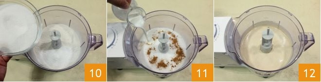 Vierte el azúcar 10, la canela en polvo y la leche en hilo 11, luego activa el procesador hasta obtener una mezcla densa y homogénea 12.