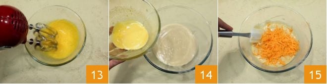 En un bol aparte separa las yemas de las claras, reservando estas últimas; bate las yemas 13 con una batidora eléctrica y añádelas a la mezcla que has obtenido 14 junto con la zanahoria rallada 15.
