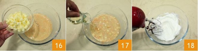 Añade los dados de manzana bien escurridos del agua acidulada 16 y luego el aceite en hilo 17, mezclando bien con una espátula para integrar todos los ingredientes. En un bol aparte monta con una batidora eléctrica o con varillas manuales las claras que has reservado 18;