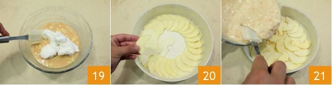 cuando las claras estén blancas y espumosas, únelas a la mezcla mezclando con la espátula de abajo hacia arriba 19. En este punto, unta con mantequilla y forra con papel de horno un molde de 22 cm de diámetro y luego cubre toda la base con las láminas de manzana (bien escurridas del agua y limón) una junto a la otra, cubriendo toda la superficie de manera uniforme 20. Una vez terminado, vierte delicadamente la mezcla 21.