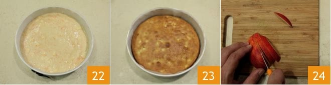 Nivela bien la mezcla con la ayuda de una espátula 22 y luego hornea en horno estático precalentado a 170° durante 60 minutos (o 150° durante 50 minutos si es horno ventilado): si la superficie de la tarta se oscurece demasiado, a mitad de la cocción cubre la tarta con papel de horno o aluminio. Una vez cocida 23, sáquela del horno y déjala reposar dentro del molde durante 5 minutos; posteriormente desmóldala y colócala sobre una rejilla para que se enfríe completamente. Ahora puedes proceder a la decoración: lava la manzana roja bajo agua corriente fresca, córtala por la mitad sin pelarla y luego en rodajas 24.