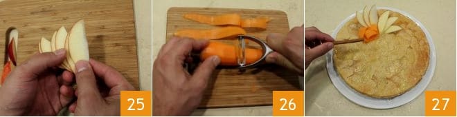 Una vez cortada la manzana 25, toma la zanahoria y con un pelador haz rodajas muy finas 26. Cuando la tarta se haya enfriado completamente, decora al gusto con las rodajas de manzana roja, con la zanahoria y con la ramita de canela 27. Finalmente, sirve y disfruta de la tarta de manzana y zanahoria.