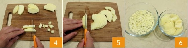 Reduce la manzana a dados 4, poniéndolos en el bol con agua y limón a medida que los cortas, y luego toma la segunda manzana, cortándola en láminas 5, colocándolas siempre en agua y limón 6.