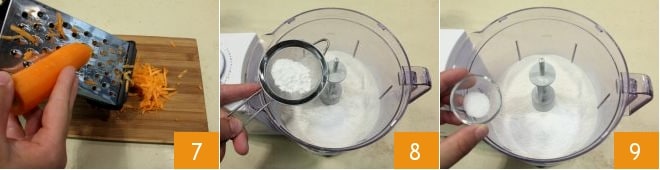 Lava y pela las zanahorias, luego rállalas 7 y reserva. En un procesador de alimentos coloca la harina tamizada junto con la levadura 8 y luego añade la pizca de sal 9.
