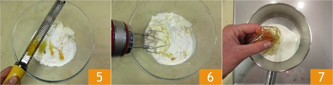 Vierte también la miel, la ralladura de medio limón y media naranja 5, añade también 200 g de nata fresca líquida. Trabaja los ingredientes con las varillas eléctricas 6 hasta obtener una crema lisa. Calienta en un cazo los 20 g restantes de nata fresca líquida y la gelatina escurrida y exprimida con delicadeza 7: haz que la gelatina se disuelva muy bien.