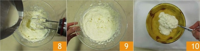 Vierte todo sobre la crema de mascarpone 8 y trabaja durante unos segundos con las varillas eléctricas. Una vez lista 9, vierte la crema de mascarpone y nata en el molde 10