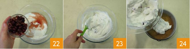 Vierte en el mismo bol las 20 cerezas reservadas y cortadas en rodajas 22, mezcla todo con energía de arriba hacia abajo 23. Ahora retoma la base ya compactada, vierte la crema 24 y guarda la tarta de queso en la nevera durante al menos 2 horas.