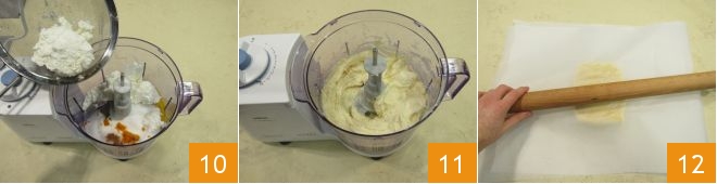 Por último, añade también la ricotta 10 y bate hasta obtener una crema lisa 11; reserva. Recupera la masa y quítala del film, golpéala con el rodillo para ablandarla un poco, luego divídela en dos partes, una de las cuales debe ser el doble de grande que la otra, y comienza a estirar el bloque más grande entre dos hojas de papel de horno 12.
