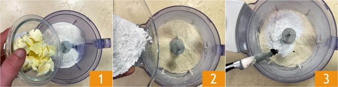 Para preparar la tarta de sémola y chocolate empieza con la masa quebrada, realizada con el método del arenado. Vierte la harina en un procesador junto con la mantequilla fría cortada en trozos 1. Si quieres, puedes utilizar la batidora de pie: bastará con insertar la pala. Acciona las cuchillas varias veces hasta obtener una mezcla arenosa. Usar el procesador a intervalos evitará que la masa se caliente excesivamente. Apaga las cuchillas y añade el azúcar glas 2 junto con las semillas de la vainilla (la vaina te servirá, así que no la tires) y una pizca de sal 3.