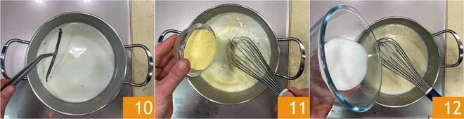 Retira la vaina de vainilla 10, añade una pizca de sal y vierte la sémola en forma de lluvia, mezclando con un batidor de mano para evitar que se formen grumos 11. Añade también el azúcar y sigue mezclando. Serán necesarios unos 5-7 minutos de cocción, a fuego moderado.