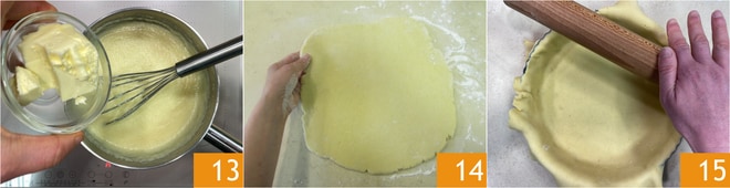 Ahora apaga el fuego y añade también la mantequilla 13, al final deberá tener una consistencia cremosa. Deja templar durante unos 10 minutos. Extiende la masa con la ayuda de un poco de harina, alcanzando un espesor de unos 5-6 mm 14. Enróllala en el rodillo y desenróllala sobre un molde acampanado con una base de 24 cm, un borde de 26 cm, alto 5,5 cm. Corta el exceso de masa con el rodillo 15.