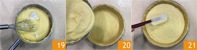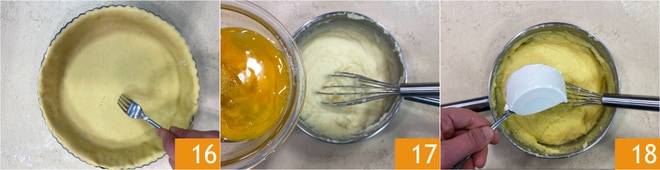 Pincha la base del molde con un tenedor 16 y resérvala un momento. Una vez que la crema esté tibia, añade los huevos 17 y la ricotta 18.