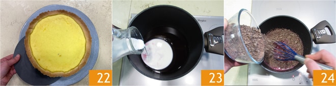 Transcurrido el tiempo de cocción, deja enfriar la tarta, luego desmóldala en el plato de servir 22. Prepara la ganache: calienta la nata en un cazo 23, añade el chocolate negro troceado 24.