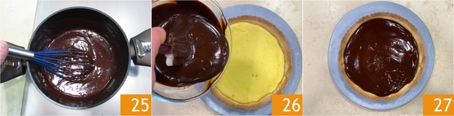 Mezcla para disolver bien el chocolate y obtener una salsa lisa 25. Vierte la ganache sobre la tarta 26, nivela la superficie y deja que se endurezca antes de servir, durante unos 30 minutos. Aquí está lista la tarta de sémola y chocolate 27.