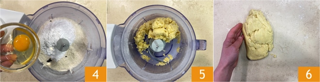 Agrega el huevo y acciona nuevamente el robot por unos instantes, esta vez bajando la velocidad para que las cuchillas mezclen la masa sin triturar. Tan pronto como la mezcla esté amalgamada 5, transfiérela a la superficie de trabajo. Compacta rápidamente con las manos 6, así no se desarrollará el gluten.