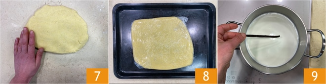 Forma un bloque liso y homogéneo, aplánalo ligeramente 7, luego envuélvelo en film transparente 8 y deja reposar en el frigorífico durante aproximadamente 1 hora. Prepara el relleno vertiendo en un cazo la leche y la vaina de vainilla guardada 9. Lleva a ebullición.