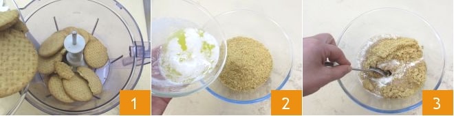 Para preparar la tarta de yogur con gelatina de fresas y frutos del bosque, comienza introduciendo las galletas en la batidora 1 y activando las cuchillas para reducirlas a polvo. Transfiere el polvo de galleta a un bol y añade la mantequilla, que habrás derretido en un cazo 2. Mezcla bien 3 para obtener una mezcla homogénea.