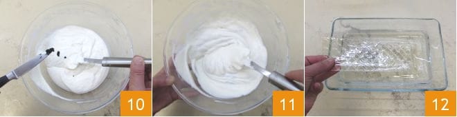 Añade las semillas de vainilla a la mezcla cremosa 10 y mezcla de nuevo, hasta que quede homogénea 11. En este punto, pon a remojar la gelatina durante unos 10 minutos en agua fría 12.