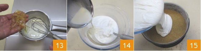 Calienta la nata en un cazo, y después del tiempo de remojo, escurre la gelatina ya blanda y añádela a la nata caliente 13, mezclando hasta que se disuelva completamente. Añade el líquido a la mezcla cremosa de yogur 14, mezcla cuidadosamente para incorporarlo de manera uniforme, luego saca el molde desmontable del congelador y vierte la mezcla sobre la base de galleta 15, nivelándola delicadamente.