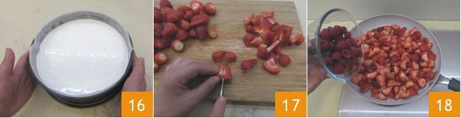 Pon en el refrigerador para que se endurezca bien durante al menos 2 horas 16. Mientras tanto, ocúpate de la gelatina para la cobertura. Limpia y lava las fresas y córtalas por la mitad 17. Ponlas en una sartén grande junto con las frambuesas 18