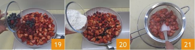 Y los arándanos 19, y añade también el azúcar glas 20. Mezcla y cocina a fuego lento durante al menos 10 minutos, luego pasa la pulpa obtenida a través de un colador 21.