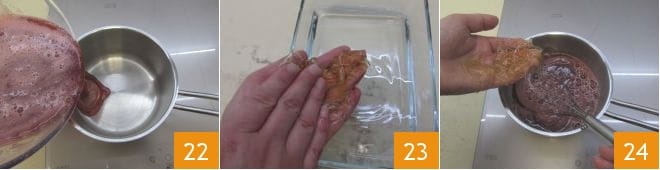 Transfiere la pulpa a un cazo 22, pon a remojar la gelatina en agua fría durante 10 minutos 23, escúrrela y añádela a la pulpa caliente en el cazo 24, mezclando bien para que se disuelva completamente.
