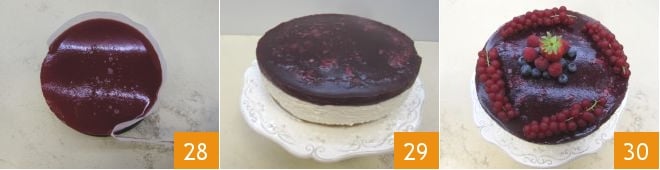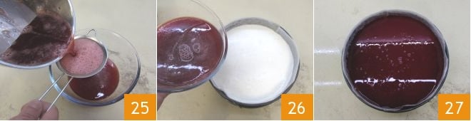 Filtra la mezcla 25 y deja que se temple, luego viértela en el molde sobre la capa de crema de yogur que mientras tanto se habrá endurecido 26. Nivela bien y transfiere al refrigerador, donde la tarta deberá endurecerse durante otras 2 horas 27.