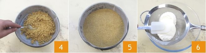 Forra con papel de horno un molde desmontable de 22 cm de diámetro y distribuye la mezcla en el fondo 4, presionando con el dorso de una cuchara para obtener una base compacta y lisa 5. Transfiere al congelador para que se endurezca durante al menos media hora, para que la mezcla se solidifique. Mientras tanto, dedícate a la crema: tamiza la ricotta en un bol 6, para eliminar el suero.