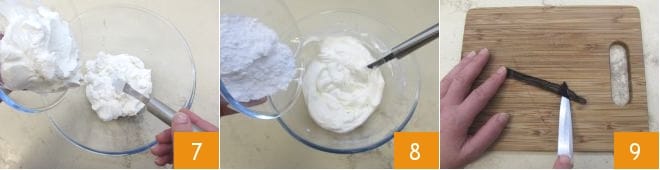 Añade el yogur griego 7 y, con una espátula o un batidor, comienza a mezclar. Agrega el azúcar glas 8, luego toma la vaina de vainilla, ábrela a lo largo y raspa las semillas con la punta de un cuchillito 9.